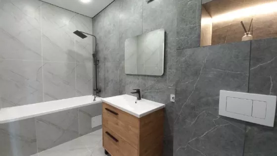 Выполнен качественный ремонт, установлен современный кухонный гарнитур с техникой, прихожая, световые приборы, сантехника.